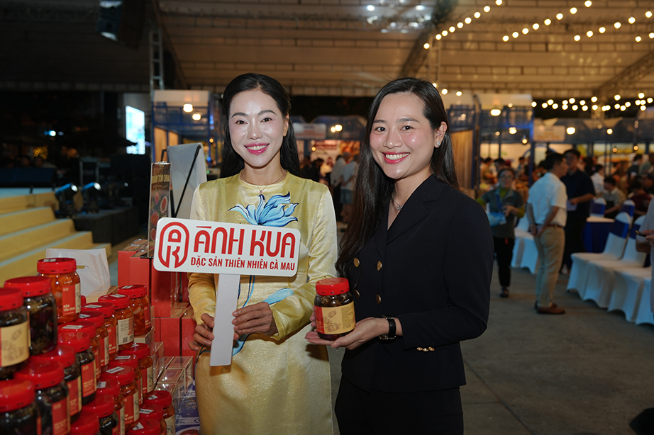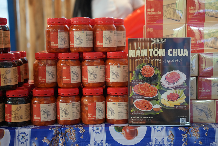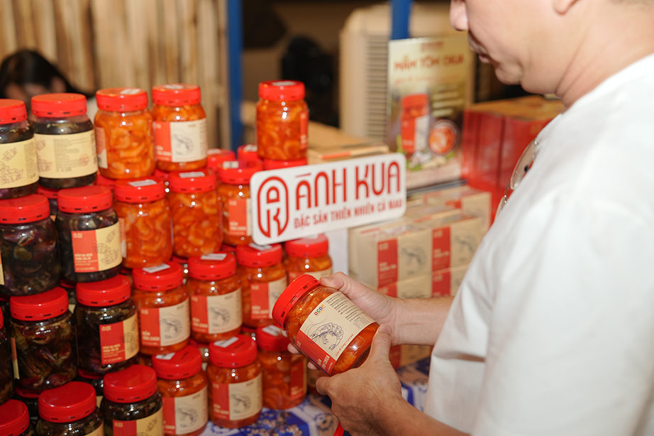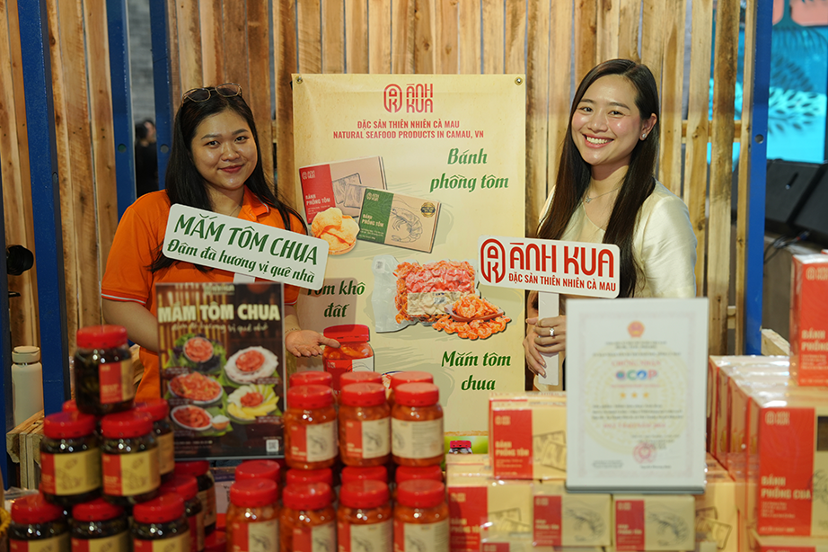 Tại không gian trưng bày các sản phẩm OCOP, đặc sản đặc trưng của tỉnh Cà Mau, Ánh Kua lựa chọn nhiều sản phẩm được chọn lọc từ nguồn nguyên liệu tự nhiên như: Mắm tôm chua, mắm ba khía, bánh phồng cua, bánh phồng tôm, tôm khô đất, mực khô và khô cá sặc…Ảnh: ÁNH KUA